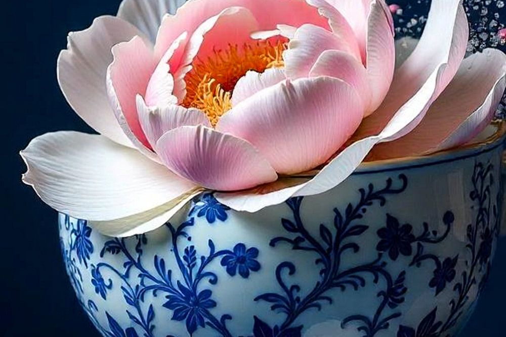 Art modern delft blue bowl standing on the ground in shards peony at the top on a black, blue background with rose petals light soft pink in colour and water drop pink balls splashing at the top.