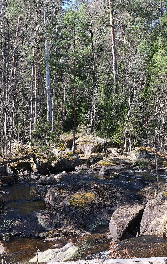 Bach in Schwedens Smaland, der überschüssiges Schmelzwasser aus dem See in den Fluss Emån ableitet. Dies geschieht im Frühjahr. Im letzten Jahrhundert konnten die Menschen hier noch Lachse fangen.