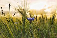 Blaue Kornblume in einem Kornfeld. Farbtupfer in der Landwirtschaft.
