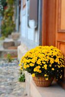 blühende Blumen in einem Korb als Dekoration vor einem Hauseingang in der romantischen Altstadt von Quedlinburg im Harz
