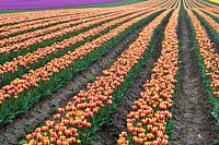 blühende Tulpen im Frühjahr auf einem Tulpenfeld bei Magdeburg in Deutschland.
