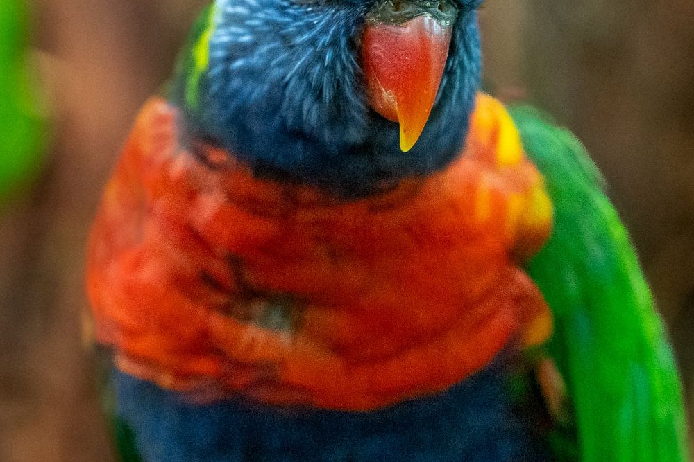 Bunter schöner Papagei schaut von einem Ast aus aufmerksam in die Kamera