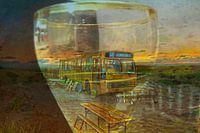 Vereinbarkeit von Beruf aus Fotografie und Abbilden der Bus wird auf Schiermonnikoog fotografiert diese alte DAF-Bus steht da in den Dünen und dient als fusionierte mit einem Foto von einem Glas und einer schilderrij mit Spiegelung und Farbspritzer, die Schaffung eines surreales Bild. durch den Unterschied…