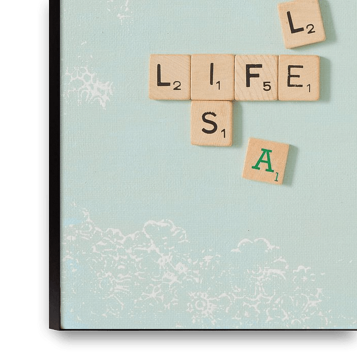 Collage eines Mädchens, das ein Kreuzworträtsel löst. Scrabble-Buchstaben wurden auf das Originalwerk geklebt. Die Stimmung ist nostalgisch. Das Werk ist quadratisch.