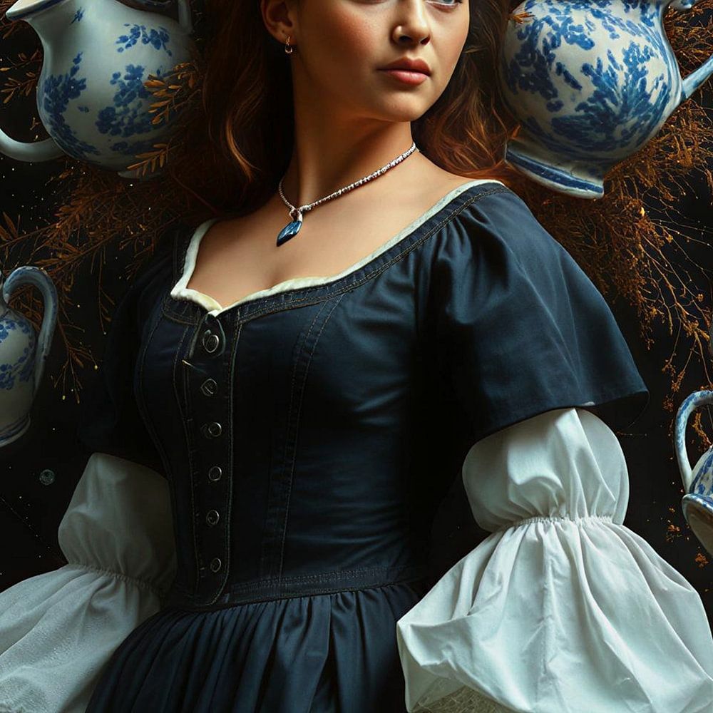 das Milchmädchen in dunkelblauem Kleid aus dem 18. Jahrhundert mit weißen Puffärmeln, verziert mit delfterblauen Krügen, Flaschen und Gläsern um sie herum auf schwarzem Hintergrund im klassischen altmeisterlichen neuen Stil.