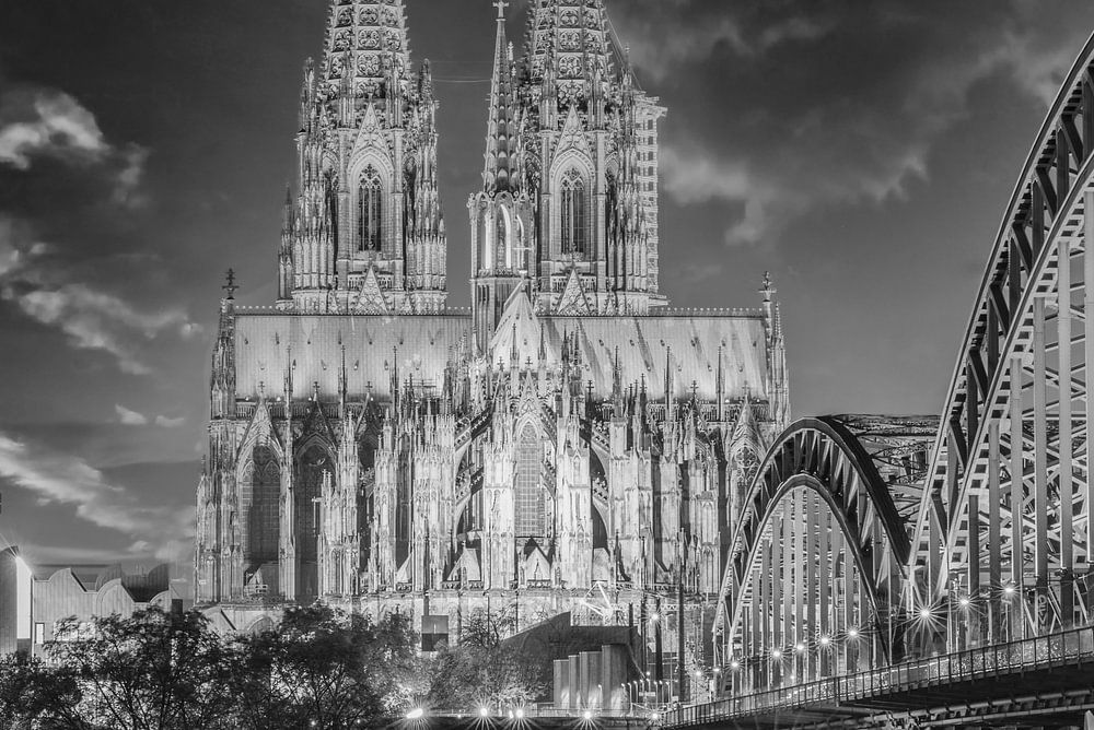 Die Szenerie ist ein Tribut an die Schönheit der Architektur und die Geschichte einer Stadt, die stolz ihre Wurzeln in der Vergangenheit trägt, während sie mutig in die Zukunft blickt. Die beleuchtete Hohenzollernbrücke dient als eine Art Verbindung zwischen den Zeiten, ein Symbol für die Kontinuität und den Wandel, der das Herz von Köln pulsieren lässt.