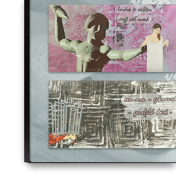 Nennen Sie es Mixed Media, nennen Sie es Collagen: Was ich mache, ist das, was die Arbeit selbst verlangt. Manchmal viele Bilder, manchmal gezeichnet und koloriert, manchmal ein Hintergrund aus Aquarellfarben, manchmal aus Gelli-Drucken, manchmal mit Schablonen, manchmal mit Text. Manchmal ist eine Farbe der Ausgangspunkt, manchmal ein bestimmtes Bild, manchmal ein Text, eine Geschichte oder einfach das Bedürfnis, Motive zu färben oder sogar Nadel und Faden zu benutzen. So…