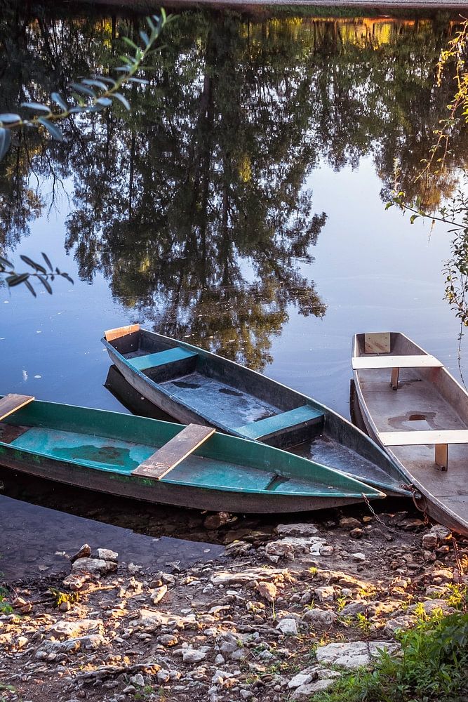 drei Holzboote liegen im Abendlicht auf dem Wasser der Dordogne in Frankreich