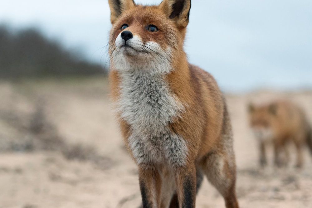 Red Foxes / Rotfuchs ( Vulpes vulpes ) standing on a sandy path, in nice winter fur, funny close-up from a low point of view.