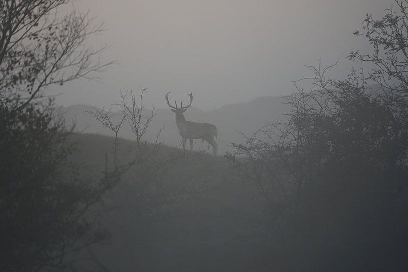 Ein Hirsch im Nebel, zwischen den Bäumen. früh am Morgen bei Sonnenaufgang. ein großer Hirsch mit großem Geweih schaut mich an