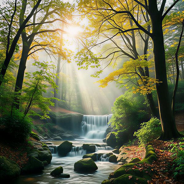 ein sprudelnder Wasserfall fließt in einem Bach mit Felsen im Wald und grünen gelben Bäumen Wald mit Lichtstrahlen von der Sonne Naturlandschaft.