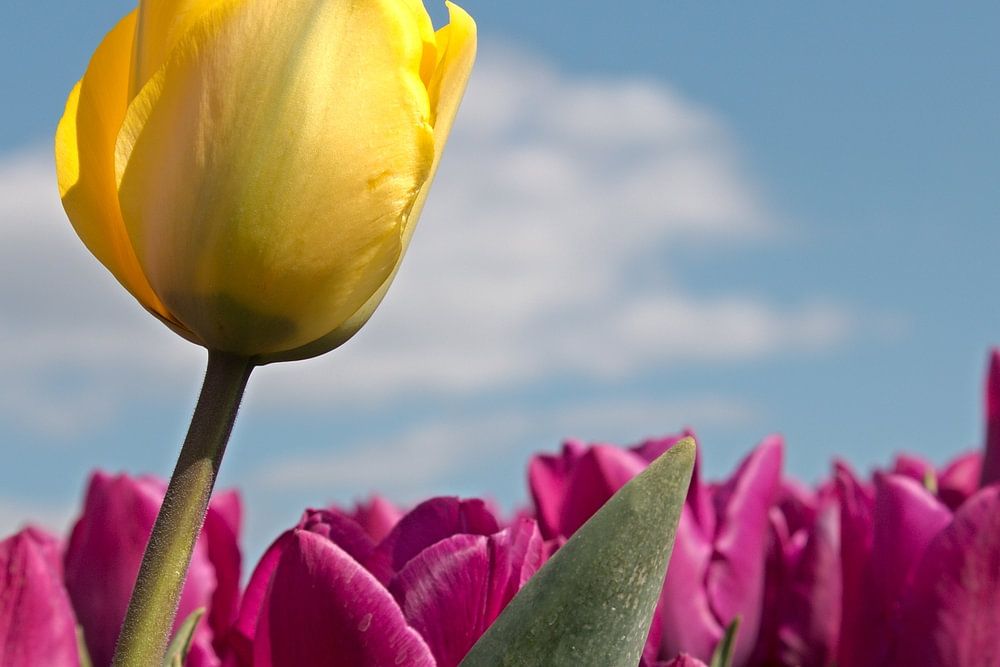 eine gelbe Tulpe zwischen violetten Tulpen mit einem schönen blauen Himmel