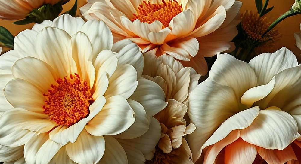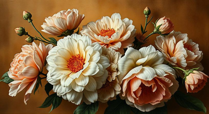 ein Strauß mit hellen Herbstfarben zu einem vollen Strauß Pfingstrosen auf orange-braunem Hintergrund.