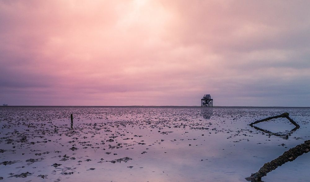 19. April 2025 Teilnahme an einer Sonnenuntergangsexkursion zum Englishman Plate. Hier gibt es ein Vogelbeobachterhaus und eine Pyramide. Bei Ebbe fällt die Platte trocken und man kann dann mit dem Boot auf die Platte fahren. Dazu muss man bis zu den Knien ins Wasser gehen.
