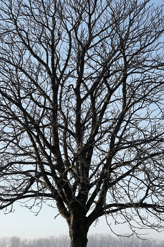 einzelner kahler Kastanienbaum auf einer Wiese am Barleber See bei Magdeburg in Deutschland im Winter