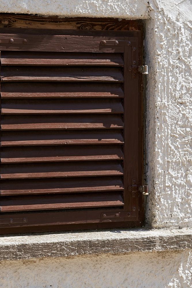 einzelnes Fenster mit einem Fensterladen an einem alten Wohnhaus in der Altstadt von Krk in Kroatien
