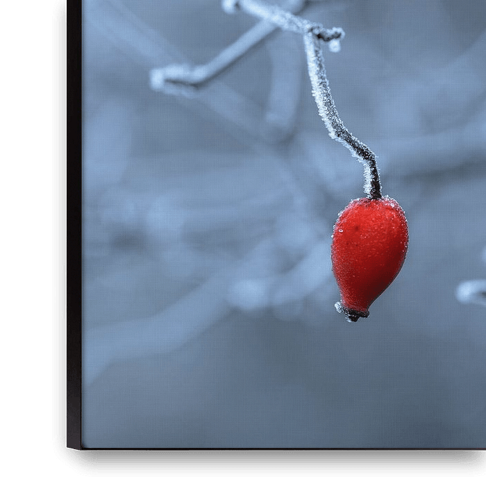 Bestelle das Foto gefrostete Zweige mit roter Hagebutte von Anouschka Hendriks als Reproduktion auf Leinwand, Alu-Dibond, als Poster, Fototapete oder Acrylglasbild.