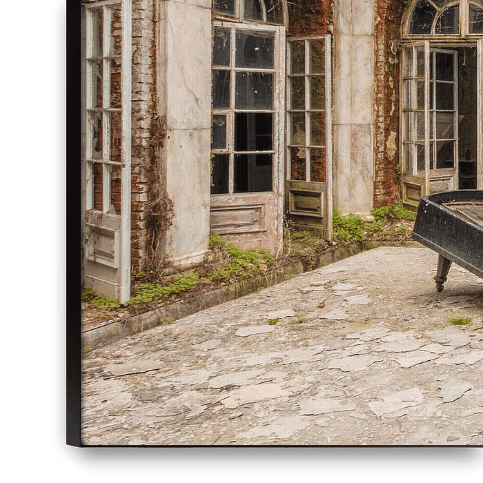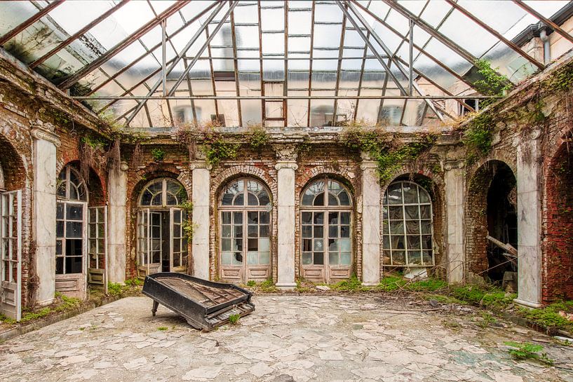 in verlassenes Klavier liegt still im Inneren eines verfallenen Palastes