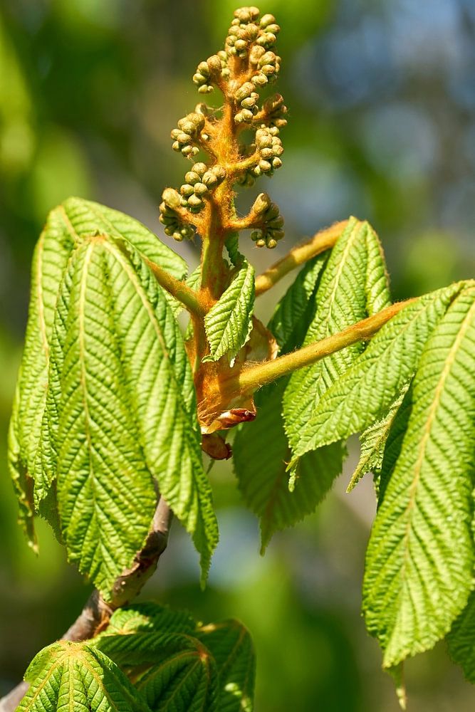 junge Blätter und Blütenstand einer Rosskastanie direkt nach dem Austrieb im Frühling im Herrenkrugpark bei Magdeburg