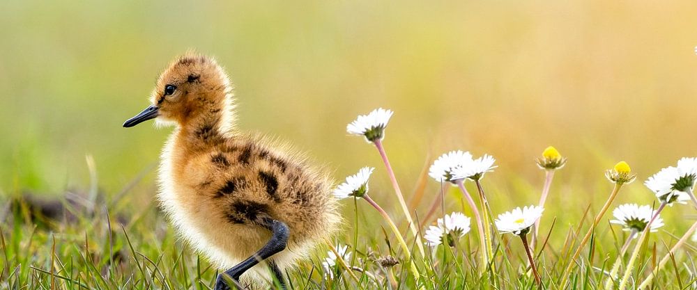 Eine niedliche junge Uferschnepfe tritt zum ersten Mal im Sonnenlicht in die Welt der Weiden hinaus.