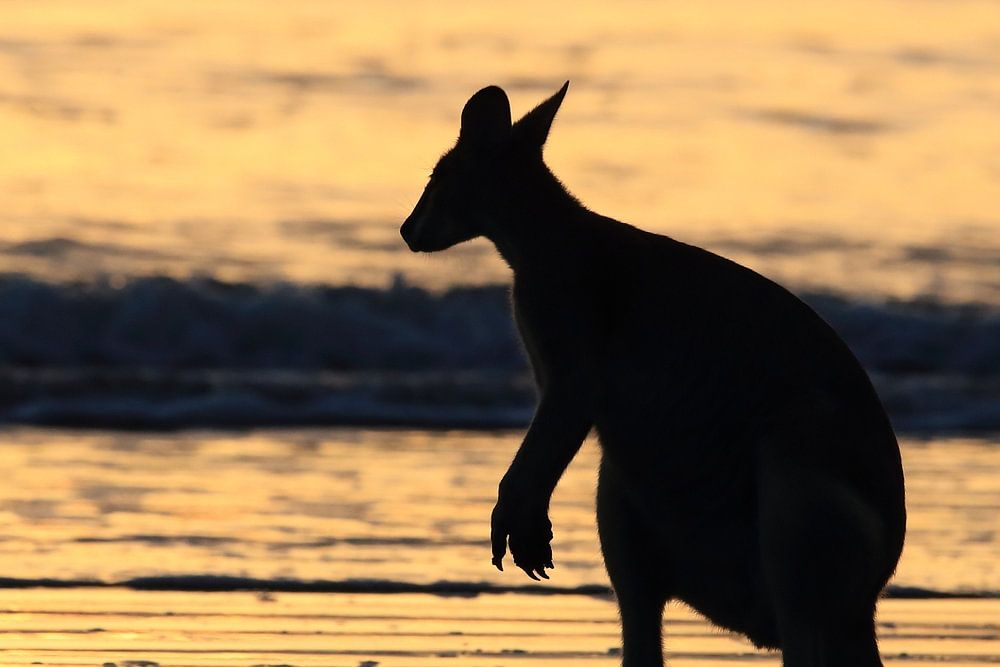 kangaroo on beach at sunrise, mackay, north queensland, australia