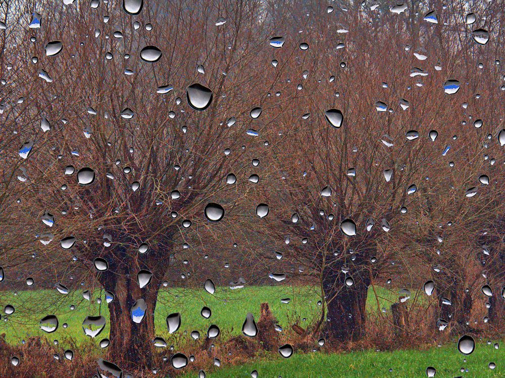 durch eine Glasscheibe mit Regentropfen fotografiert