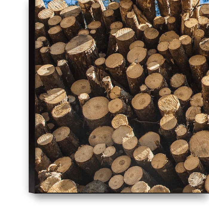 stapel bomen met in de achtergrond het nog bestaande bos in kikkerperspectief