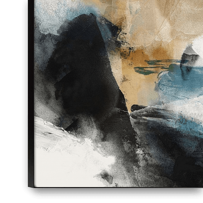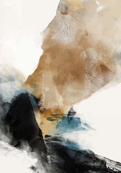 Dieses Kunstwerk entfaltet sich wie ein langsames geologisches Gedächtnis - Schichten von Erdtönen, gedämpften Blautönen und tiefen Schwarztönen, die in ruhigem Gleichgewicht auseinanderdriften und aufeinanderprallen. Die Komposition suggeriert Erosion, Sediment und die Zeit selbst, eingefangen in einem Moment der schwebenden Bewegung.…