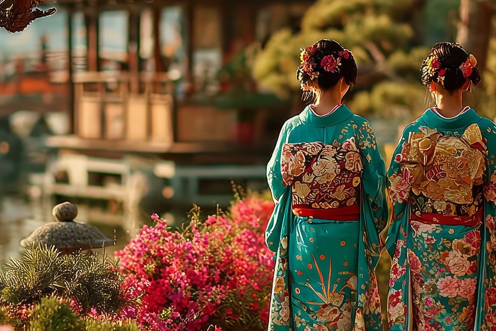 Geisha im Garten, malerisches Japan mit fiktiven Personen in einer japanischen Fantasielandschaft oder Kulisse
