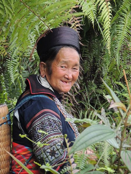 Deze vrouw begeleidde ons tijdens onze wandeltocht in Sapa, Vietnam. Op haar rug droeg zij een mand met verkoopswaren.