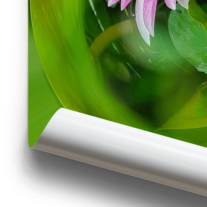 rosa Seerosen in polarer Zusammensetzung, quadratisch. Planeten-Komposition. Das Foto wurde digital bearbeitet, so dass ein Fischaugen-Effekt entsteht. Dies kann mit einem quadratischen Druck erfolgen.