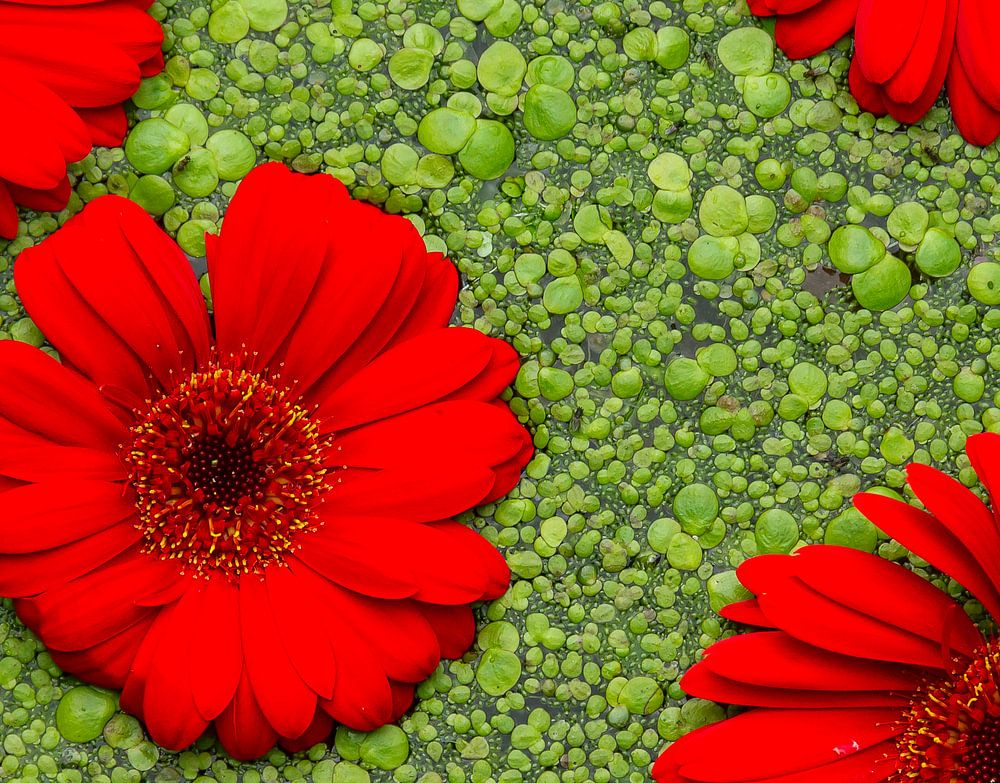 leuchtend rote Gerbera liegen auf und zwischen der grünen Wasserlinse