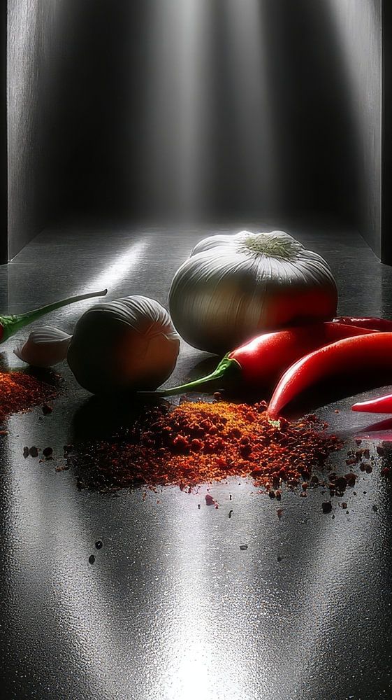 Centraal in de afbeelding zie je vurige rode pepers, robuuste tenen knoflook en frisse partjes limoen – producten die symbool staan voor intensiteit, versheid en karakter.