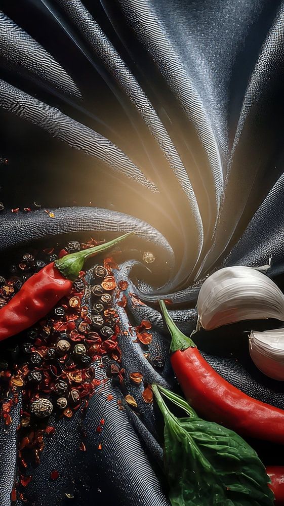 Centraal in de afbeelding zie je vurige rode pepers, robuuste tenen knoflook en frisse partjes limoen – producten die symbool staan voor intensiteit, versheid en karakter.