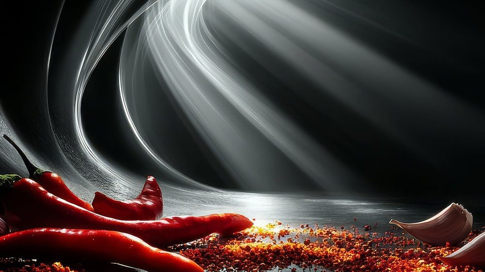Centraal in de afbeelding zie je vurige rode pepers, robuuste tenen knoflook en frisse partjes limoen – producten die symbool staan voor intensiteit, versheid en karakter.