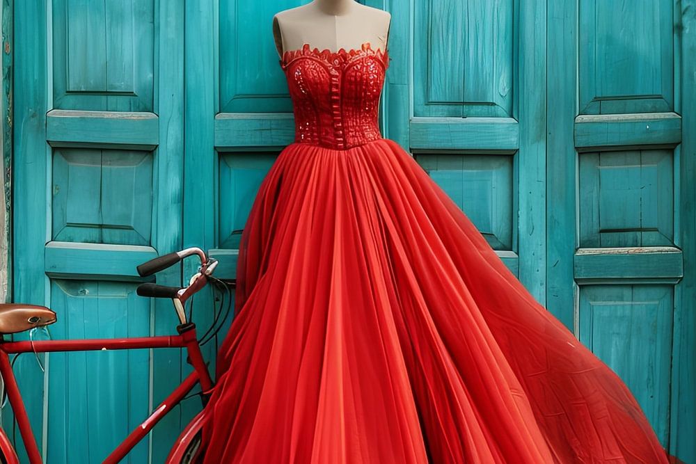 rotes Kleid mit Fahrrad und blauem Hintergrund Künstliche Intelligenz mit Photoshop