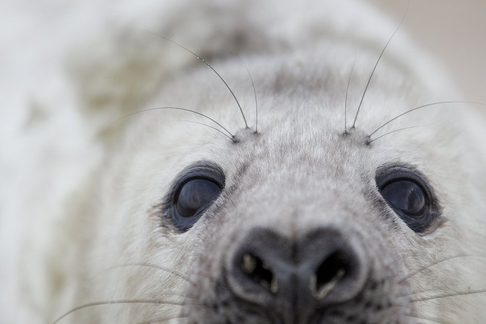 Wunderschönes Kegelrobbenjunges, das hier liegt und darauf wartet, dass seine Mutter es wieder füttert. Eine Besonderheit der Kegelrobbenwelpen ist, dass sie mit einem wunderschönen weißen Fell geboren werden, das auch als Lanugo bezeichnet wird. Es ist ein Babyfell, das den Körper in der Zeit warm halten soll, in der das Jungtier noch eine dicke Fettschicht entwickeln muss, die es als erwachsene Robbe warm halten wird. Bis dahin schützt das Lanugo den Welpen vor der Kälte an Land. Nach etwa 4 Wochen beginnt es zu haaren und der Welpe verliert das weiße Fell.