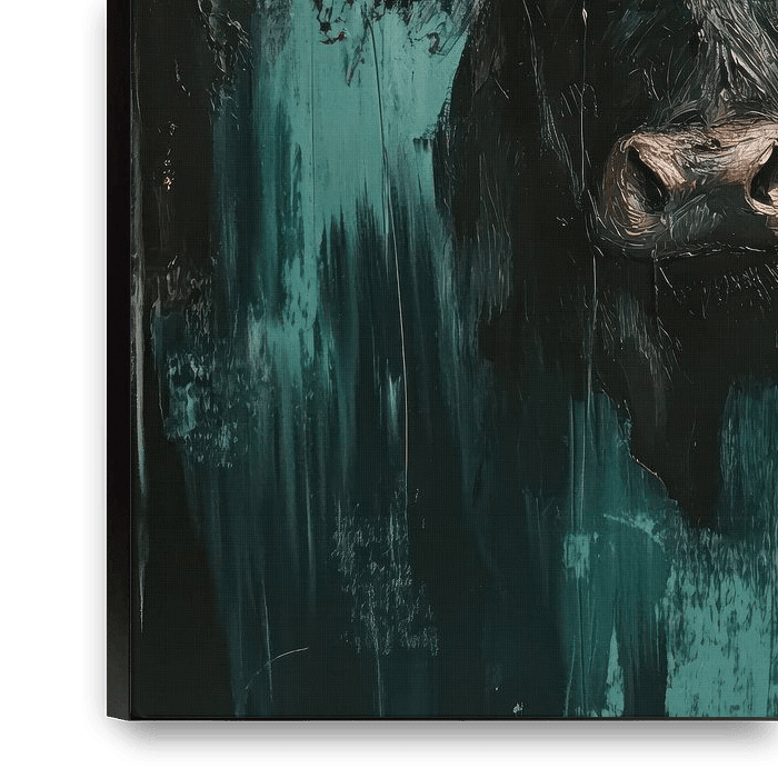 Dieses Gemälde zeigt ein kraftvolles und beeindruckendes Bild eines schottischen Hochlandbewohners, das in einem expressiven und abstrakten Stil festgehalten wurde. Das Gesicht des Stiers steht im Mittelpunkt des Werks, mit einem intensiven Blick, der den Betrachter direkt anschaut. Die Hörner des Tieres ragen stark hervor und bilden…