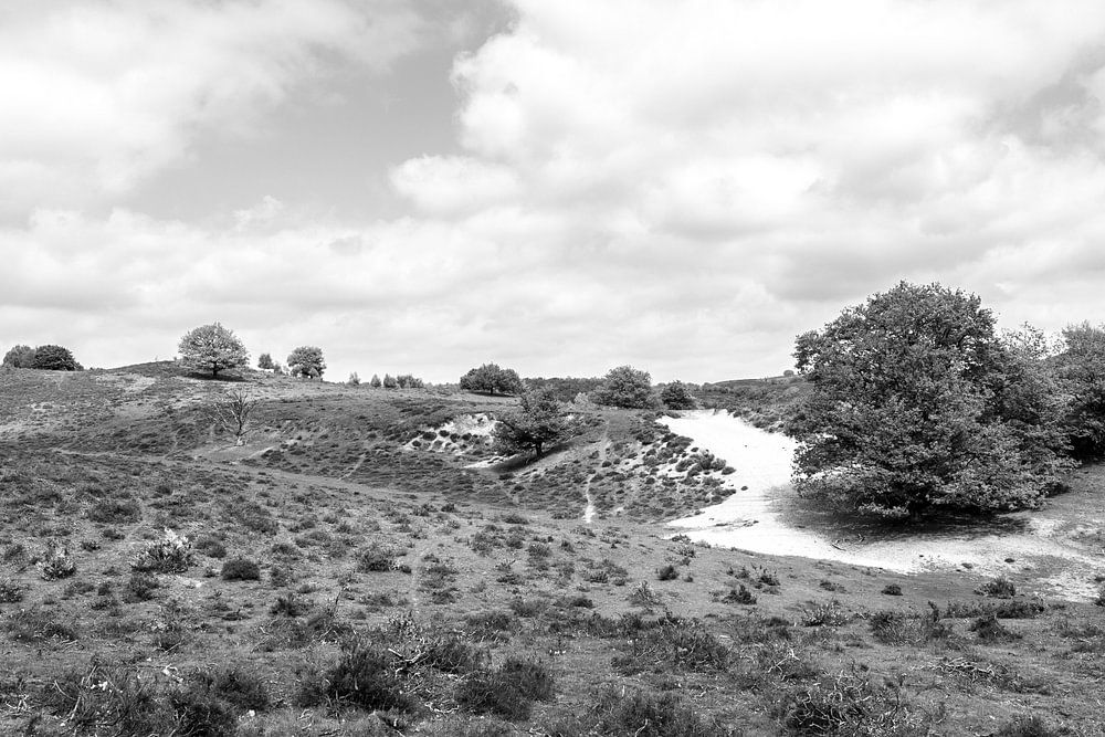Ein Schwarz-Weiß-Foto des Heidekrauts im Naturschutzgebiet Veluwe Zoom. Mit Heidekraut, einem bedeckten Himmel und einem sandigen Weg.