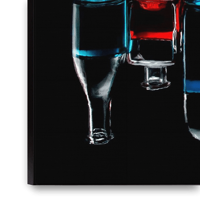sechs unterschiedlich große Flaschen mit sechs verschiedenen Farben darin, die den Betrachter überraschen. Das Spiegelbild der zweiten Flasche von rechts hat sich verändert. Es handelt sich also um ein : Trompe l'oeil.