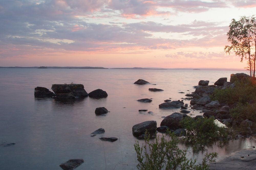 sonnenuntergang durch die tannen auf den steinen am wasser, spiegelungen von skandinavien, karelien