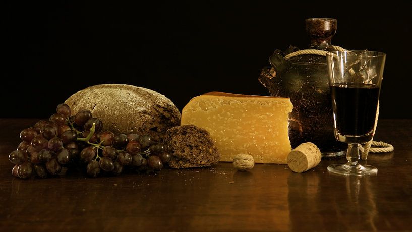 dit stilleven van brood, kaas en wijn zal zeker mooi staan in uw interieur van keuken of eetkamer.