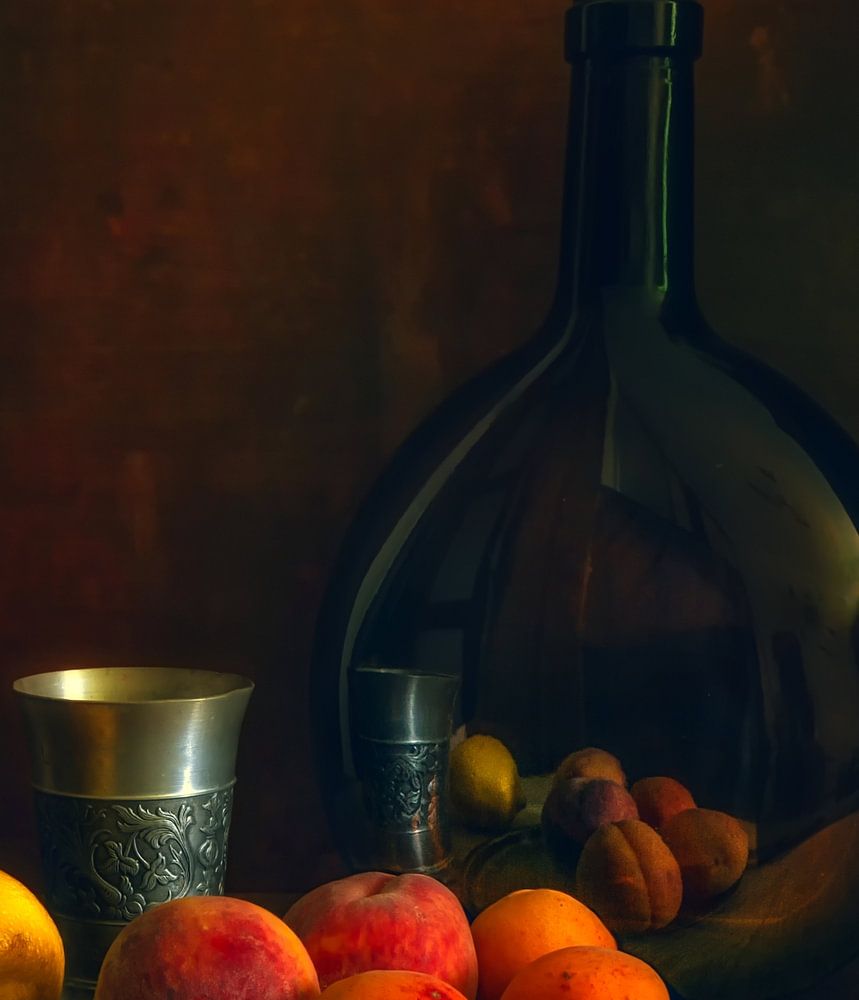 Stilleben mit Pfirsichen, Aprikosen und einer großen dunklen Glasflasche, in der sich die Früchte spiegeln. Jahrgang.