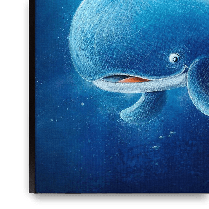 Bestelle diese Illustration süßer blauer Wal von Stefan Lohr als Reproduktion auf Leinwand, Alu-Dibond, als Poster, Fototapete oder Acrylglasbild.