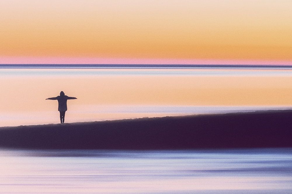 Das digital bearbeitete Foto zeigt einen Sonnenuntergang im Wattenmeer. Der malerische, minimalistische Charakter des Bildes entsteht durch die Verwischungen im Watt und im Himmel, durch Anpassung der Farben sowie den leichten Highkey-Effekt. Auch die Vignette trägt dazu bei. Die Person mit ausgebreiteten Armen betont die horizontale Geometrie des Bildes....