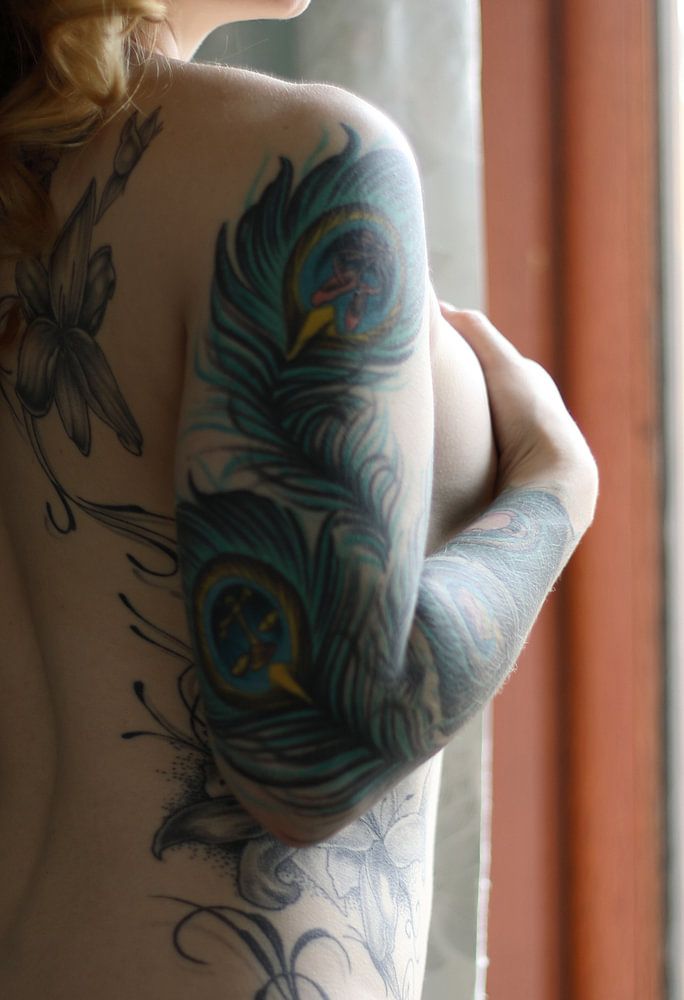 Tätowierungen: Auf dem Rücken und dem Arm der Frau sind Tätowierungen zu sehen. Eine der Tätowierungen ähnelt einer Pfauenfeder.