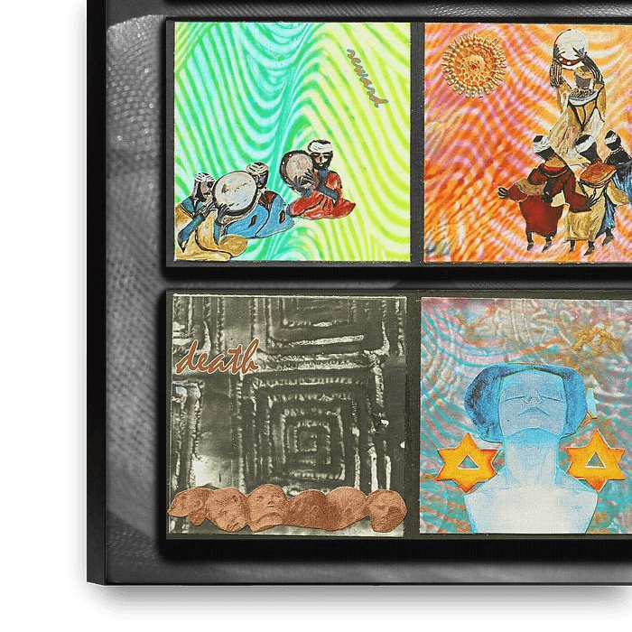 Nennen Sie es Mixed Media, nennen Sie es Collagen: Was ich mache, ist das, was die Arbeit selbst verlangt. Manchmal viele Bilder, manchmal gezeichnet und koloriert, manchmal ein Hintergrund aus Aquarellfarben, manchmal aus Gelli-Drucken, manchmal mit Schablonen, manchmal mit Text. Manchmal ist eine Farbe der Ausgangspunkt, manchmal ein bestimmtes Bild, manchmal ein Text, eine Geschichte oder einfach das Bedürfnis, Motive zu färben oder sogar Nadel und Faden zu benutzen. So…
