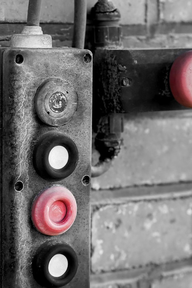 verfallenes industrieelles Bedienelement für einen Kran mit Notschalter an der Fassade eines Gebäudes im ehemaligen Handelshafen in Magdeburg