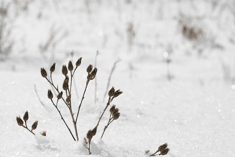 eingeschneite Pflanze auf einer Wiese in einem kalten Winter