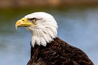 Porträt eines wachsamen amerikanischen Weißkopfseeadlers mit scharfem Schnabel und hellem Auge vor einem dunstigen blauen Hintergrund
